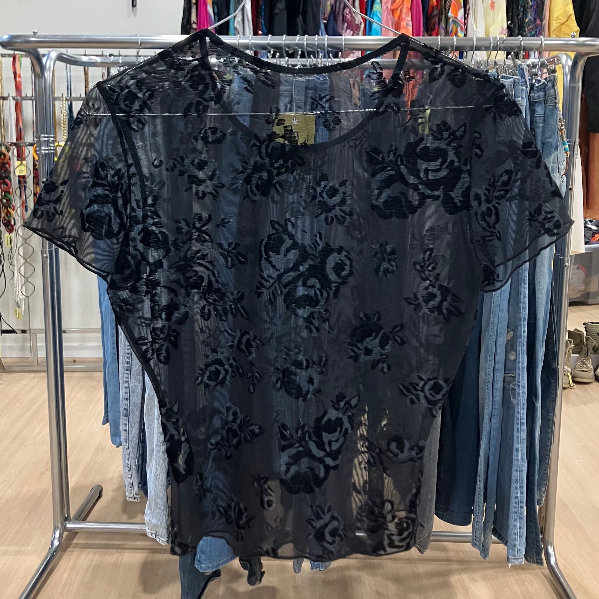 valery sheer black velvet floral lace tee